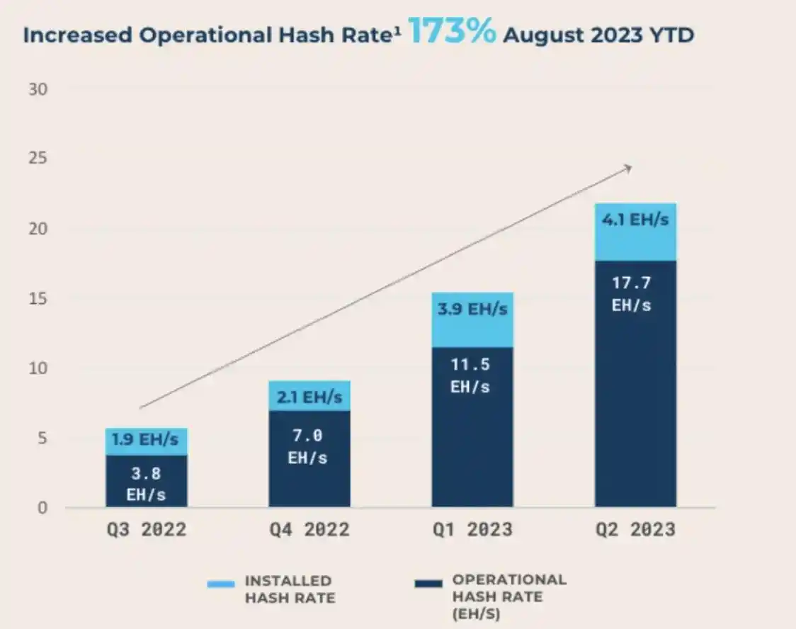 运营/启动的哈希率(EH/s)1:Q2–23 17.7 EH/s,Q2–22 0.7 EH/s,增长 2429%,Q2–23 17.7 EH/s,Q1–23 11.5 EH/s,增长 54%。