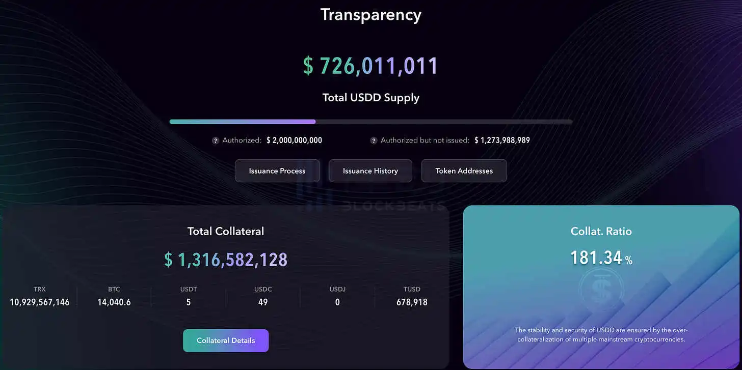 另一项风险是USDD ,目前其供应量为 7.26 亿美元,由约 10 亿美元的 TRX 和约 4 亿美元的 BTC 支撑。目前,该系统存在严重超额抵押,但一旦出现平仓,可能会导致 TRX 大量抛售。当然,USDD 也有可能只是坐在那里,随着 TRX 或 BTC 价格上涨而变得越来越超额抵押,从而随着时间的推移成为一个较小的问题。这仍然是一个相关的风险,买家应该认识到这一风险。