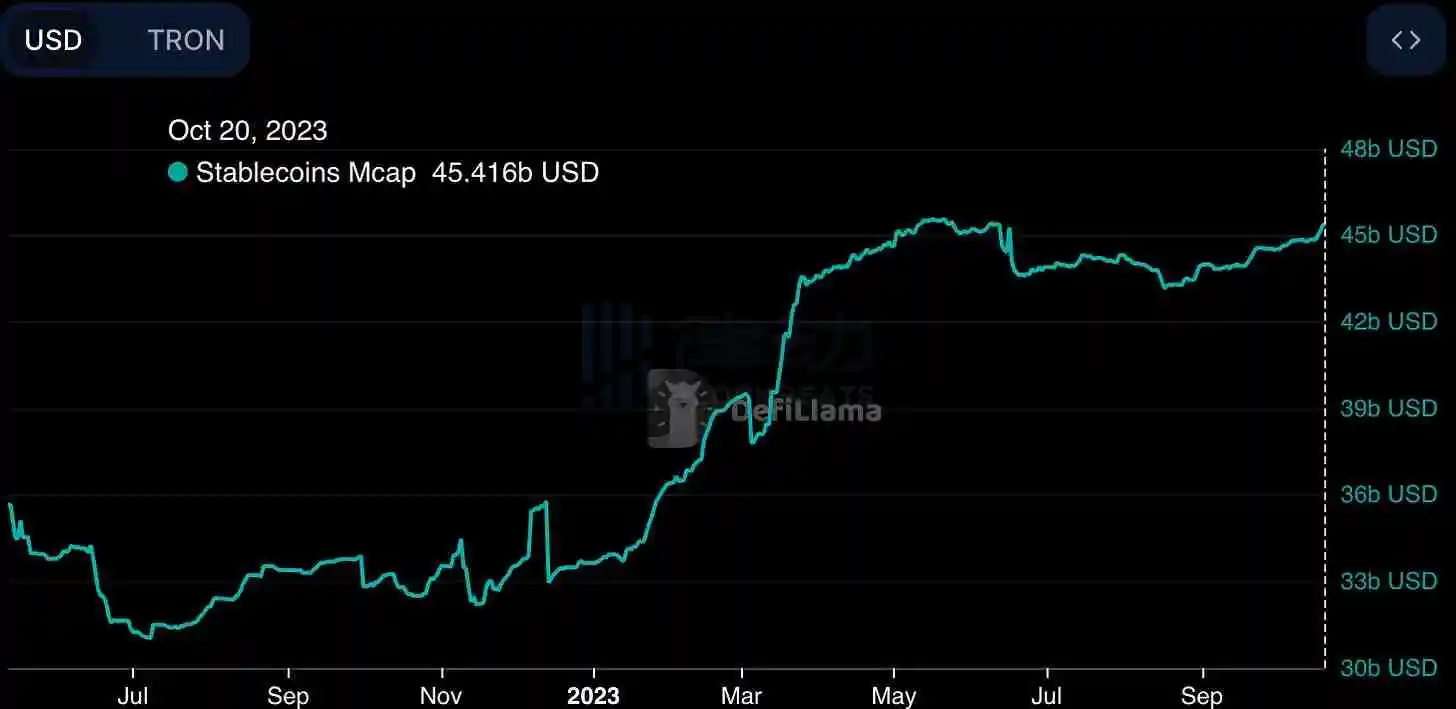 Tron 上的稳定币总供应量接近创下新高,描绘出与以太坊截然不同的景象: