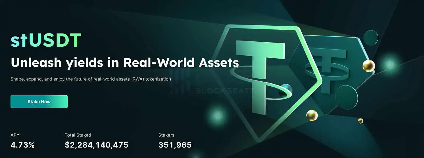 stUSDT于 2023 年 7 月推出,作为建立在 Tron 上的 RWA 市场(现在也可在以太坊上使用),用户可以用 USDT 换取 stUSDT 并获得 4.73% 的变基奖励(截至撰写本文时)。基本的 RWA 策略没有明确定义;「合约中质押的美元稳定币将投资于低风险、高评级的 RWA」。我们假设本金投资于类似于 MakerDAO 或 Frax Finance 的短期美国政府证券。
