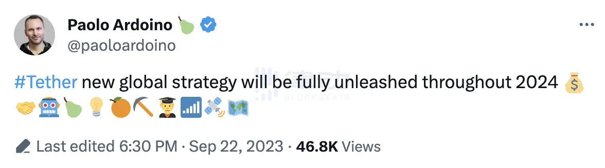 9 月 22 日,Tether 首席技术官 Paolo Ardoino 在其社交平台表示,Tether 新全球战略将于 2024 年全面实施。根据其暗示,新全球战略或将包括投融资合作、AI、新能源比特币挖矿、教育、全球范围业务扩张等;10 月,这位首席技术官又宣布,「Tether 现实世界生态(Real World Ecosystem,简称 RWE)即将推出。」