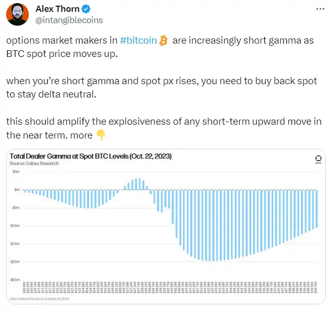 Galaxy Research 研究主管 Alex Thorn 在社交媒体上发文表示,近几日随着 BTC 现货价格上涨,比特币的期权做市商越来越多的选择做空 Gamma,但当做空 Gamma 并且现货价格上涨时,则需要回购现货以保持 Delta 中性,这应该会放大近期任何短期上涨的爆发力。据其分析 Amberdata 数据的结果显示,做市商做空 Gamma 的起始价约为 28,500 美元,如果比特币价格上涨至 32,500 美元,做市商需要在后续每上涨 1% 时购买 2,000 万美元的 Delta。这意味着,随着现货价格走高,做市商需要回购越来越多的比特币,如果短期内出现任何上涨,这应该会增加上涨的幅度。