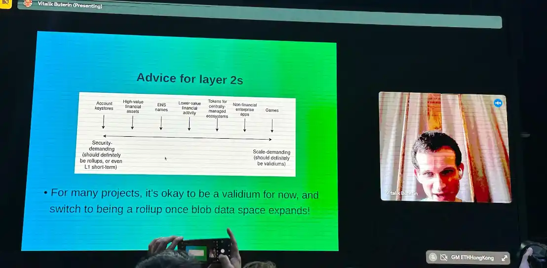 从 Vitalik 现场展示的图来看,对于许多项目来说,当前选择使用 Validium 可能是一个合理的选择,因为它提供了一种在保证交易有效性的同时,实现链下数据可用性的解决方案。
