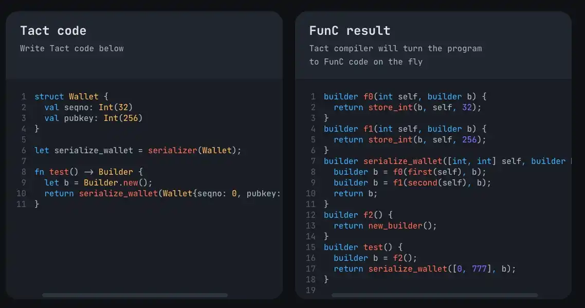 更好的合约调试工具,并降低审计困难。开发者用 TACT 语言开发后会被编译成 FunC 合约,有时候开发者并不清楚编译成的 FunC 合约是否正确。因此,开发者在调试合约的时候,往往不仅仅调整 TACT 语言,也会直接调整 FunC 合约。因此,希望有更好的合约调试工具能帮助开发者轻松调试智能合约,至少要让开发者不必去调 FunC 合约。此外,合约的审计案例少,审计较慢,还有很多合约审计公司对于 TACT 和 FunC 也是初学。