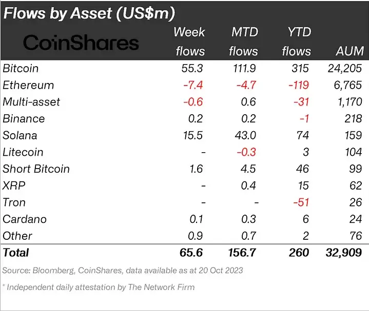 截至 10 月 20 日当周的资产流量显示,比特币和 Solana 是最受欢迎的。资料来源:CoinShares