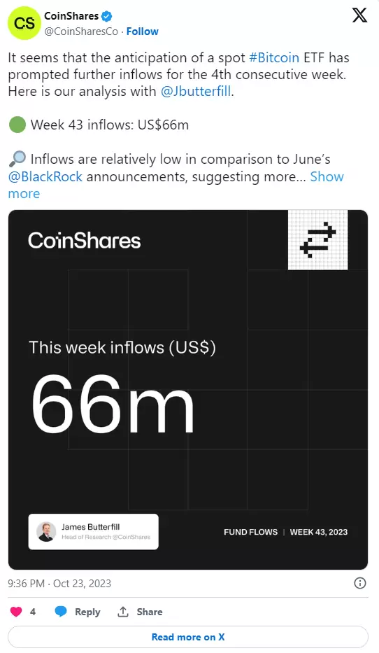 CoinShares:在比特币 ETF 的争夺中,加密产品连续第四周流入