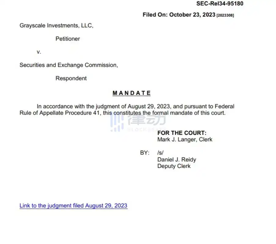 这意味着,D.C. 巡回法院做出了最终裁决,结束了美国证券交易委员会 (SEC) 与灰度之间的纠纷,实际上命令该机构取消拒绝该资产管理公司现货比特币 ETF 申请的决定。 该案的正式结案实质上巩固了法院两个月前的初步裁决,即 SEC 拒绝灰度试图将其价值约 170 亿美元的 灰度比特币信托基金 (GBTC) 转换为现货 ETF 的决定是「武断且反复无常」的。 灰度发言人 Jennifer Rosenthal 在周一案件结案后的一份声明中表示:「灰度团队期待继续与 SEC 进行建设性合作,将 GBTC 转换为 ETF,GBTC 已做好运营准备,我们打算代表我们的投资者尽快采取行动。」