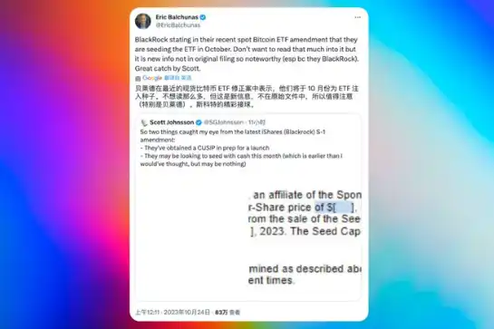 然后 @SGJohnsson 10.23 晚上 11:23 发布了最早的推文,说明了 CUSIP 的事。然后彭博社专门关注 ETF 的高级 ETF 分析师 @EricBalchunas 推波助澜一把。