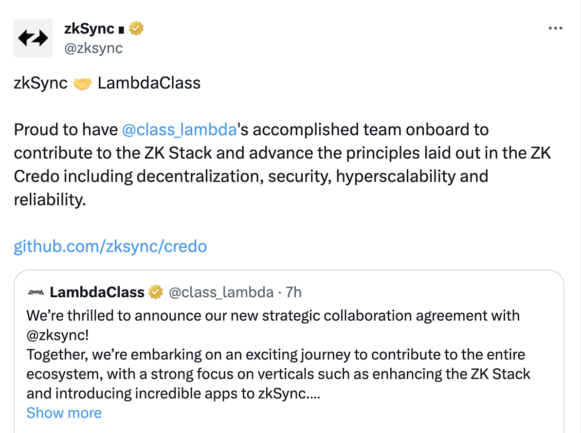 报道,10 月 24 日,此前帮助 Starknet 完成 V12 以及 cairoVM 开发的 LambdaClass 团队宣布与 zkSync 达成新的战略合作协议,重点将关注生态的垂直领域,例如增强 ZK Stack 并向 zkSync 引入应用程序。LambdaClass 还表示过去几天内一些顶尖工程师已经加入了 zkSync 团队。