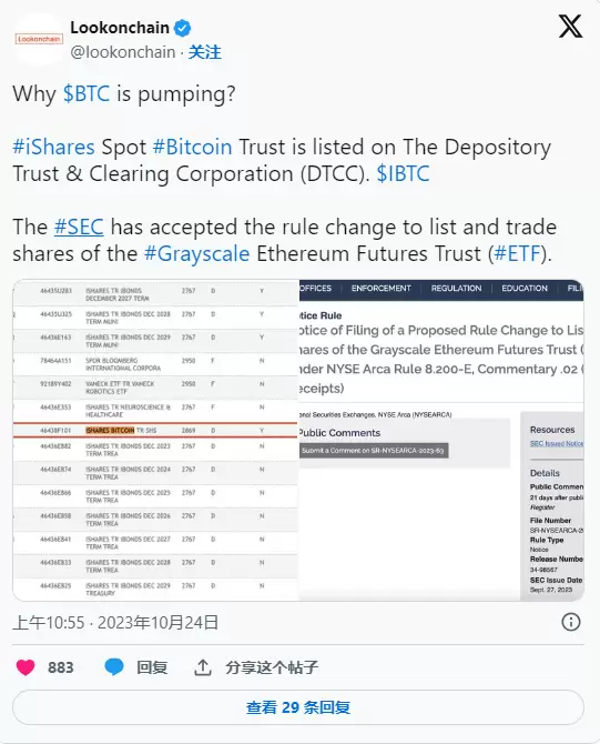 加密货币社区和分析师将此举归因于贝莱德现货比特币 ETF 的股票注册——美国证券交易委员会 (SEC) 仍在考虑这一事项。