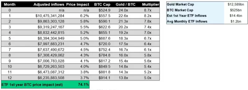 Galaxy Digital 研究助理 Charles Yu在 10 月 24 日的一篇博客文章中估计,比特币 ETF 推出后第一年的潜在市场规模将达到 14.4 万亿美元。他以黄金 ETF 为基准,通过评估资金流入比特币 ETF 产品的潜在价格影响,得出了 74% 的数字。根据 Yu 的估计,比特币的价格将在 ETF 推出后的第一个月上涨 6.2%,然后稳步下降,到第 12 个月涨幅为 3.7%。