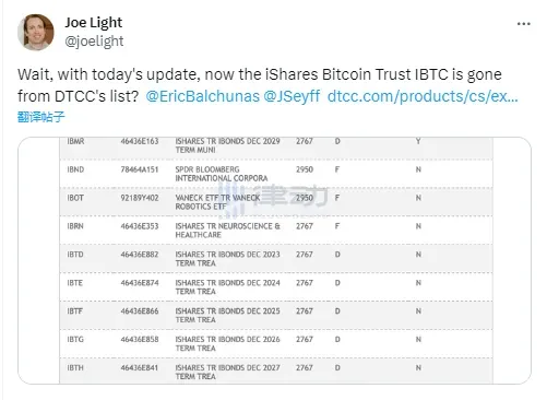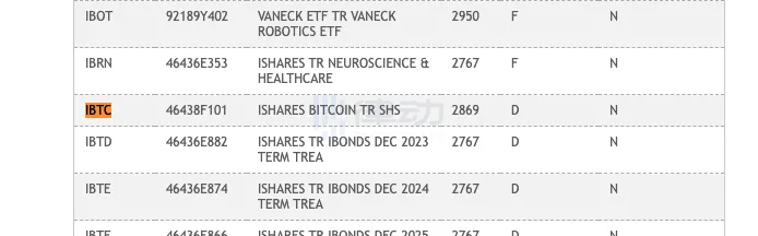 昨日,彭博社 ETF 分析师 Eric Balchunas 发文称发现,资管巨头贝莱德子公司 iShares 比特币信托已在 DTCC(美国证券集中保管结算公司)上市。股票代码将是「IBTC」。