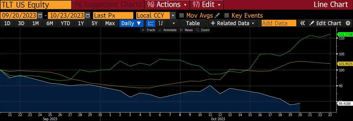自从美联储于 2023 年 9 月 20 日的会议以来,长期美国国债(即 TLT)下跌了 11%,比特币上涨了 11%,黄金上涨了 1%。市场担心通货膨胀,而不是经济增长,这就是为什么比特币和黄金与长期债券收益率一同上升的原因。