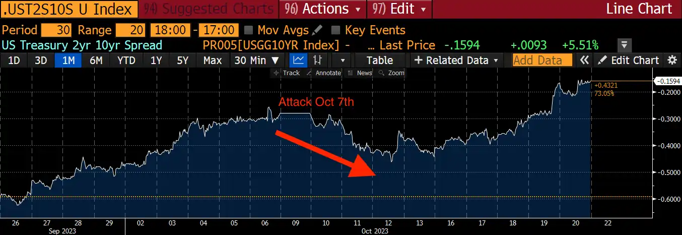 拜登一再重申美国将支持以色列,但随着战争成本不断攀升,美国国债市场重新开始下跌。收益曲线再度出现向熊市加息的趋势。没有发生什么引人注目的事情,然后加沙最大的医院被轰炸。