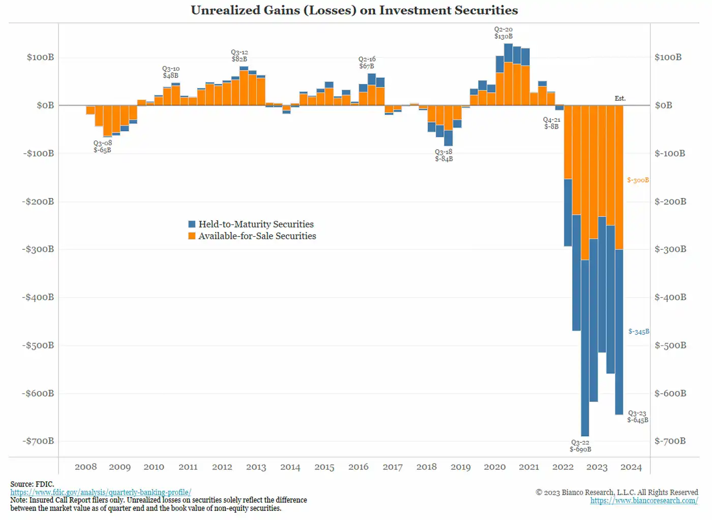 美联储知道这一点,这就是他们试图竭尽全力搪塞的原因,声称他们的政策操作有滞后,因此他们必须暂停以「研究效果」。鲍威尔先生,您打算坐多久等待呢?他们暂停的真正原因是,虽然加息有望阻止熊市加息,但如果美联储继续加息,美国地区银行将再次出现亏损。请记住,存款人宁愿选择与美联储做生意,获得 5.5% 或更高的利率,而不愿保留存款并获得较低的利率,冒着银行倒闭的风险。这些地区银行状况糟糕,但与由于连续的美联储加息而导致的损害而产生的凿子般的影响不同,这种损害是缓慢而有节奏的,正如熊市加息的冲击一样。另外,让我提醒你,美国银行体系正面临着近 7000 亿美元的未实现美国国债损失。随着长期债券价格继续下跌,这些损失将加速。