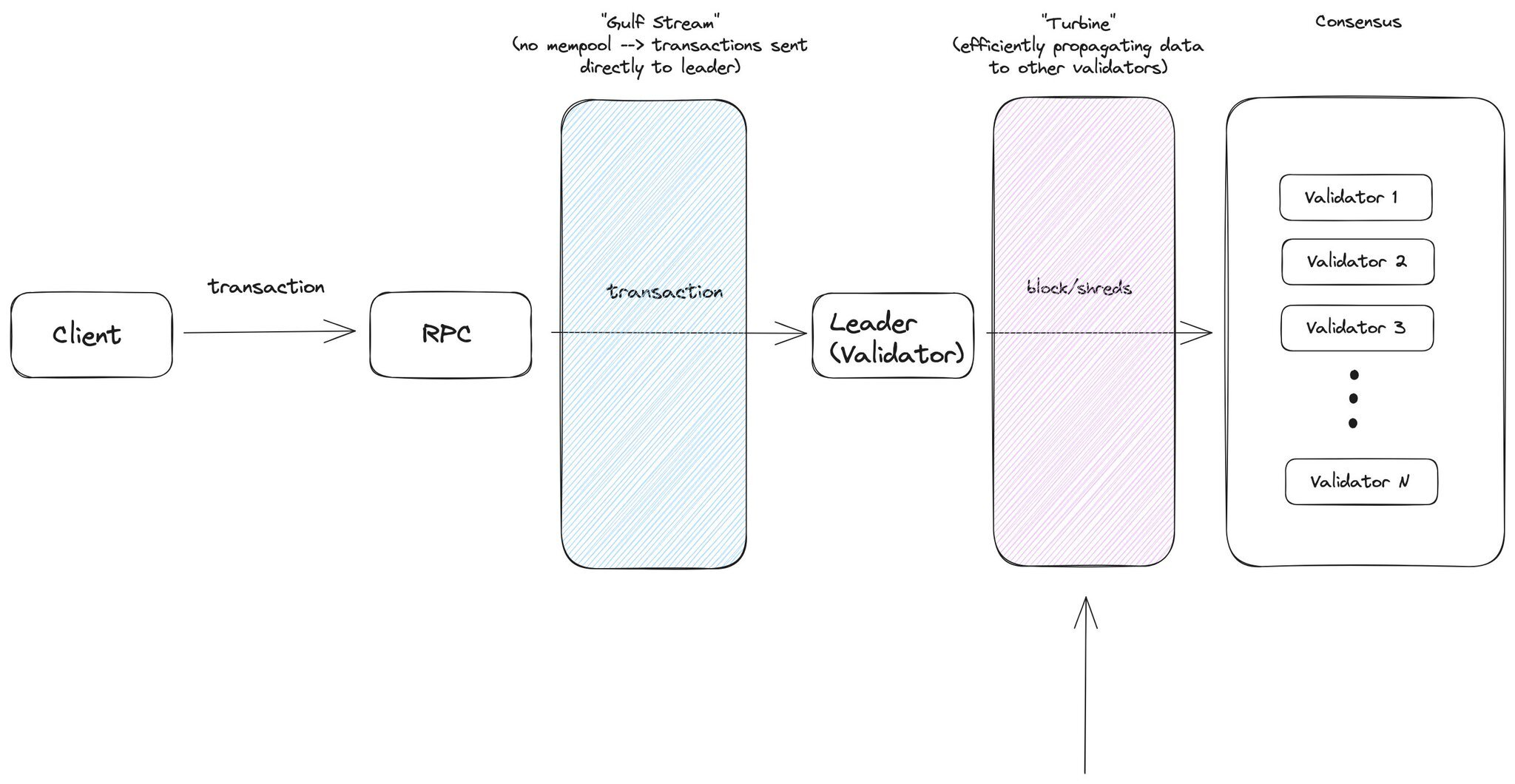 Solana 通过独特的架构设计迎接了这一挑战,促进了区块的持续创建和传播。这是通过多项关键创新实现的,例如领导者选择、Gulf Stream(消除了对内存池的需求)和 Turbine(区块传播机制)。