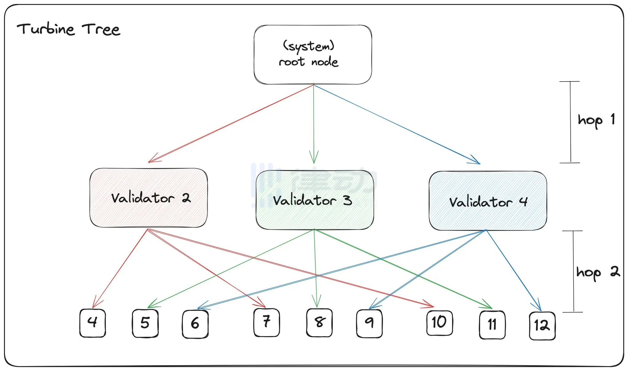 Turbine 树是 Solana 使用的一种结构化网络拓扑,用于促进验证器之间碎片(编码块数据)的有效传播。一旦碎片被正确编码到各自的碎片组中,它们就可以通过涡轮树传播,以通知网络中的其他验证器最新的状态。