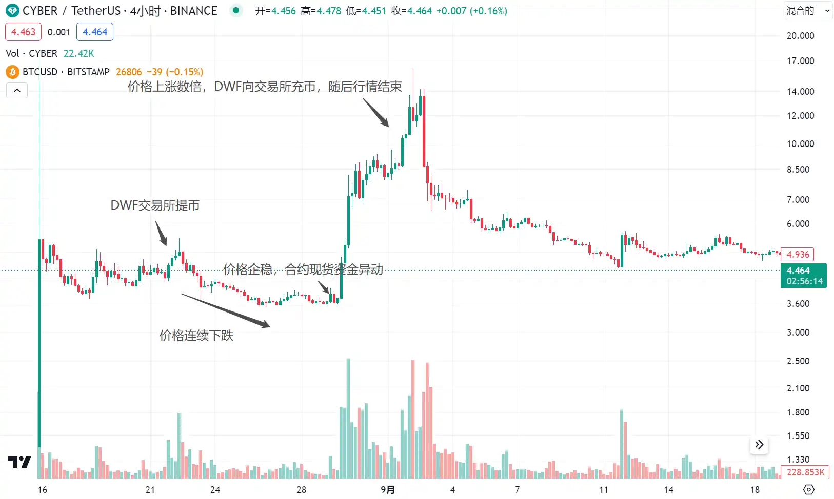 类似的操盘手法也可以在 CYBER 等标的中观察到:8 月 22 日,DWF 从币安交易所提出 17 万枚 CYBER,当时 CYBER 价格约 4.5 美元,随后价格连续下跌,最低下跌至 3.5 美元;7 天后 CYBER 上涨行情启动,最高涨至 16.2 美元,相较于 DWF 提币时的价格上涨约 3.6 倍,相较于前低 CYBER 上涨约 4.6 倍。CYBER 作为币安 Launch Pool 项目,上线早期筹码结构好,二级市场抛压小。DWF 对 CYBER 的项目的参与推断为二级市场买币拉盘,较少涉及与项目方的关系。(类似今年 2 季度 DWF 参与 PEPE、LADYS 等 Meme 币)