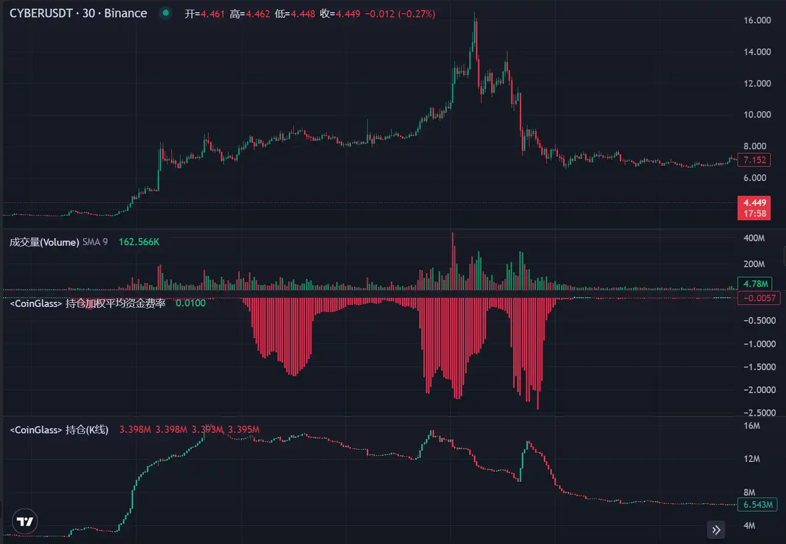 在资金数据层面,CYBER 的表现与 YGG 类似:合约数据在早期表现出持仓量的暴涨,费率的稳定;在中期表现出持仓增长的放缓,费率的下降,在后期表现出多头平仓带来的持仓下降。