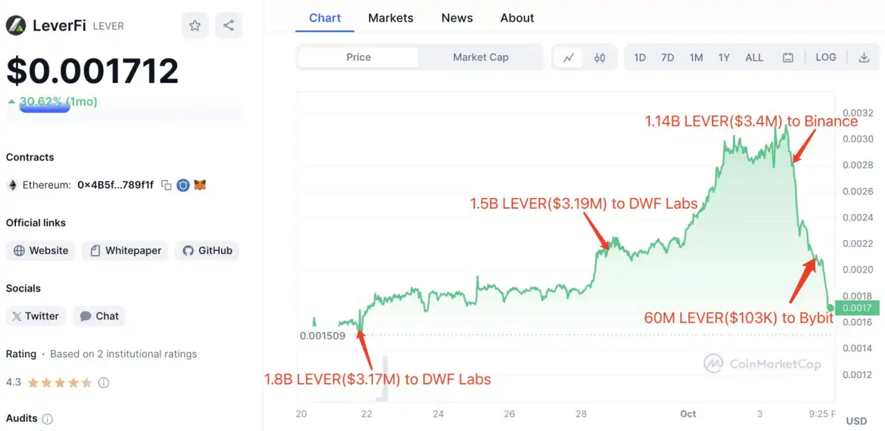 2、DWF 向项目方 OTC 买币(包装为战略投资)的标的在二级市场价格上往往首先表现出数月的下跌,而后急速的拉盘,在 DWF 向交易所充币之后行情结束(拉盘行情通常不超过 1 周);
