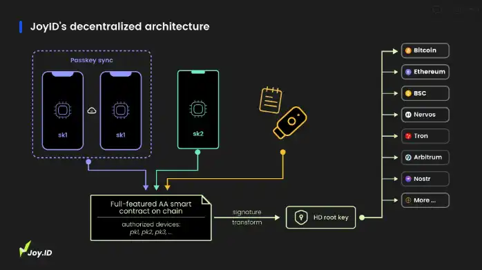 JoyID 管理的 AA 账户主要负责多设备之间的 Passkey 互相授权,并且保存 2-of-2 密钥计算的加密后的分片,另一个分片则由设备在签名时通过 Passkey 实时计算出,通过这种方式来实现 secp256r1 → secp256k1 之间的去中心化签名转换。这种方案在交易签名时不需要服务器介入,完全是在用户设备侧基于安全芯片的签名,确保了安全性、去中心化和非托管。