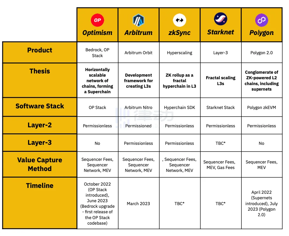 而除了 Arbitrum,其它主流 L2 如 Optimism、zkSync、Starknet、Polygon 也相继推出了 Stack 堆栈方案,试图将核心组件开源,并推进 RaaS 方案,以期抢占 Layer 2 乃至 Layer 3 的战略高地。