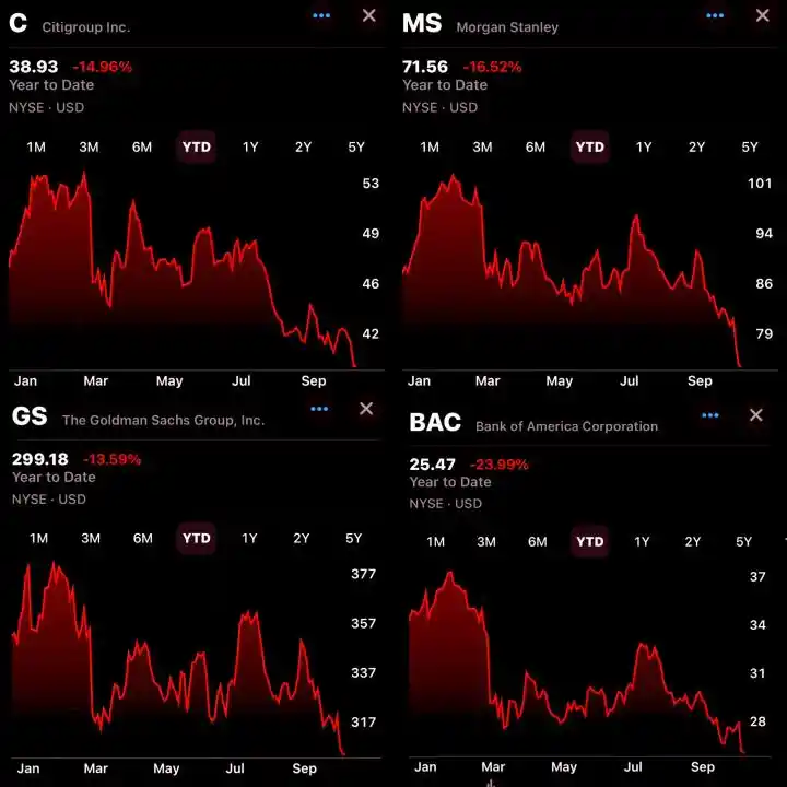 美国华尔街的四大银行——花旗(C)、摩根士丹利(MS)、高盛(GS)和美国银行(BAC)——目前处于自那次银行业危机以来的最低水平。这些银行的年初至今表现显示,目前它们的股价是最低的,甚至比今年 3 月还低。花旗集团的股价自年初以来下跌了 14%,高盛的跌幅也接近 13%。摩根士丹利的损失超过这两家,今年以来已经下跌了 16%,而美国银行则以 23% 的跌幅领先。