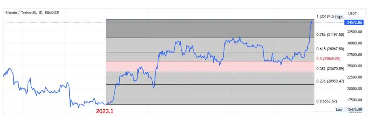 截至撰写本文时,BTC 价格为 34,572 美元,由于市场动力依然强劲,可能还会上涨。它保持在市场的中高位,上图展示的是从 2023 年初的低点到今年高点的 35,184 美元进行的评估。