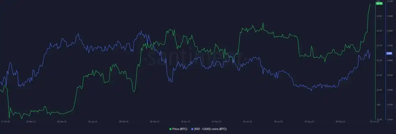 一群关键投资者也可能是促成这次涨势的原因之一。自 9 月 21 日以来,持有 100 到 1000 BTC 的鲸鱼地址,在一直在积累 BTC。一个月的时间里,这个群体的 BTC 持有量增加了 50,000 BTC,价值 17 亿美元;这使得他们的持有量从 385 万 BTC 增加到了 390 万 BTC。
