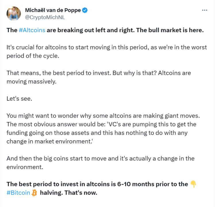 距离 BTC 减半只有不到 6 个月的时间。加密货币社区预计,这个事件将开启下一个牛市周期。根据分析师 Michaël van de Poppe 等人的观点,现在(BTC 减半前的 6 至 10 个月)是投资山寨币的最佳时机,风投们已经迫不及待地希望开始获得资金支持。