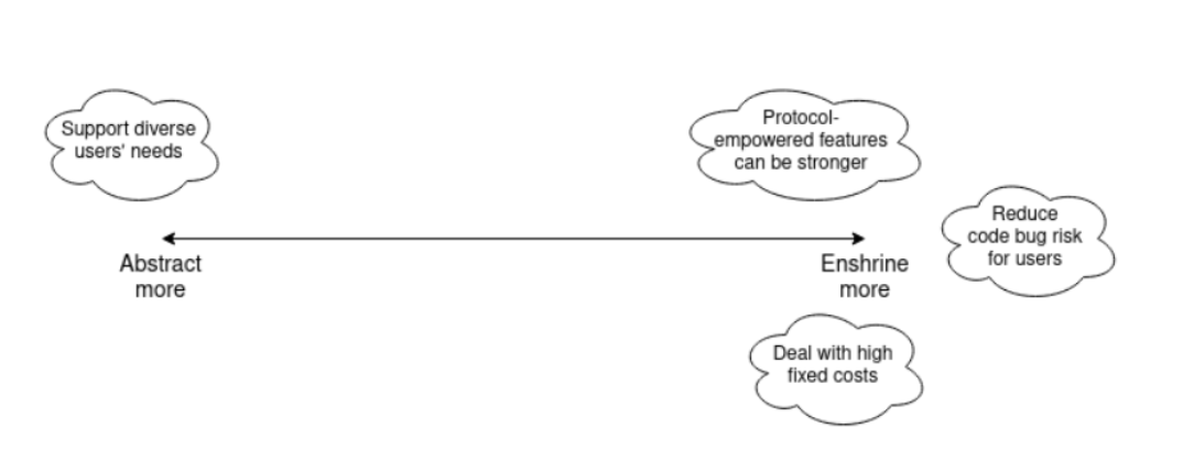 虽然以太坊的原始计划是通过在顶部构建协议使区块链安全运行,但 Vitalik Buterin 认为,以太坊的未来并非一成不变。正如行业中的一句俗语,「加密货币中没有完美的解决方案,只有权衡取舍。」封装有降低的漏洞风险和降低中心化概率的优点,但其明显缺点是它可能导致协议越来越复杂,最终变得过度扩张和笨拙。关于哪些功能应该被带入协议中,而哪些功能应该被留在生态系统其他层级,这是一个复杂的权衡问题。