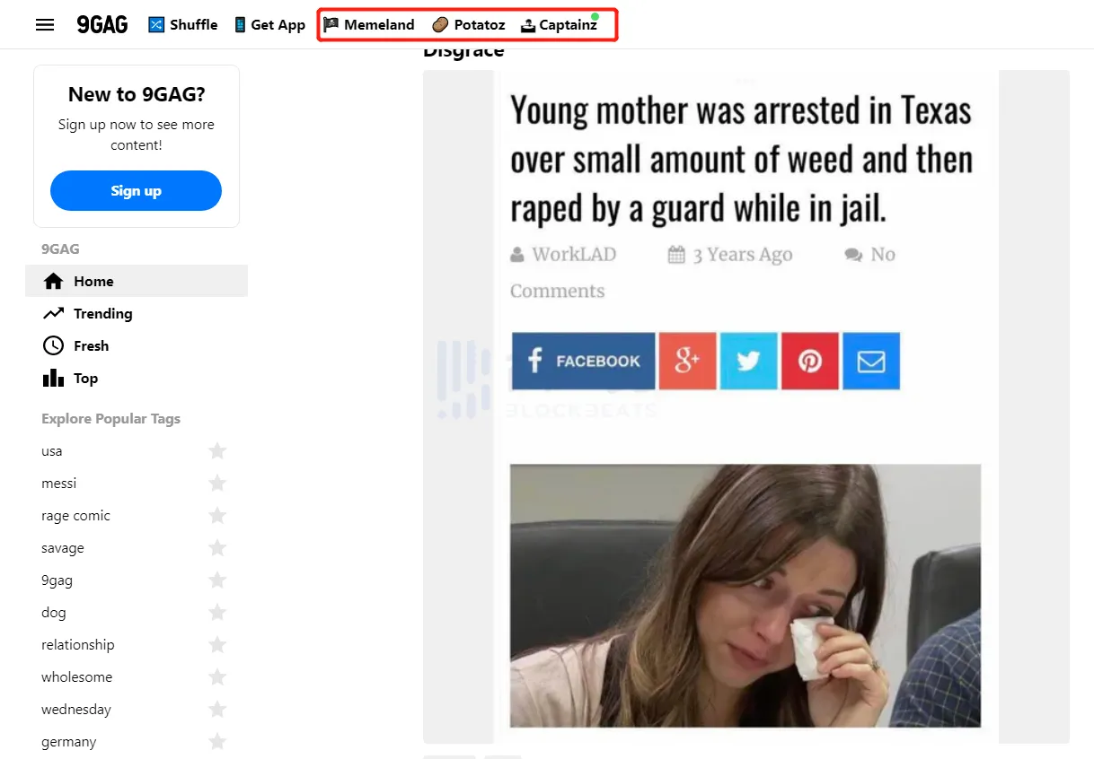 现在流量有了,随着 9GAG 的运营策略逐渐拥抱 Web3 和创作者经济,从其中向 Memeland 逐渐导流只是时间问题,目前9GAG 官网已在顶部显眼位置铺放了 Memeland 和 Potatoz 的入口。