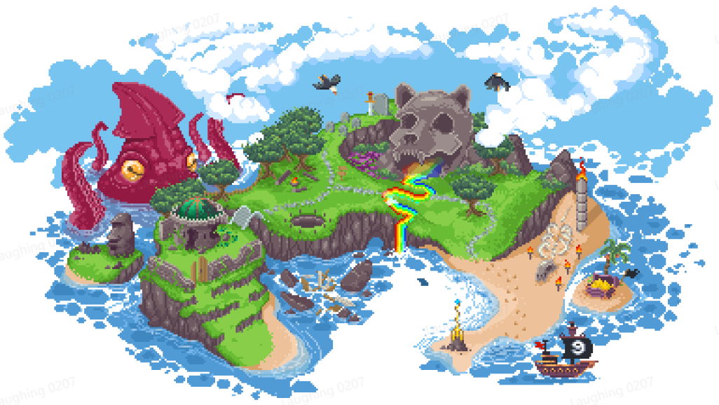 Memelands 的官方总览图显示了它们提供的内容,埋藏宝藏的小岛、未知的海域、巨大的海怪、海盗船员、发射器等等,Memelands 中的每个元素都以时尚且具有视觉吸引力的图像形式呈现。
