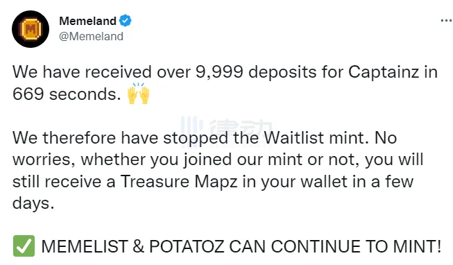 在发售开始后十几分钟官方便宣布已经收到了超过 9,999 笔存款,宣告 Waitlist 铸造已经终止(上文所述的「非担保铸造」),「担保铸造」则不受影响,在 48 小时内完成铸造即可。