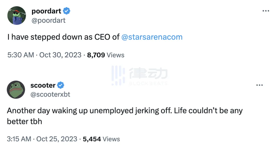随后,其 CEOChill Pill @poordart也发文表示辞任,同时在评论中回复网友疑问并指出,新任 CEO 为@scooterxbt。然而,根据@scooterxbt的动态中可以看出,其 5 天前仍处于失业状态。