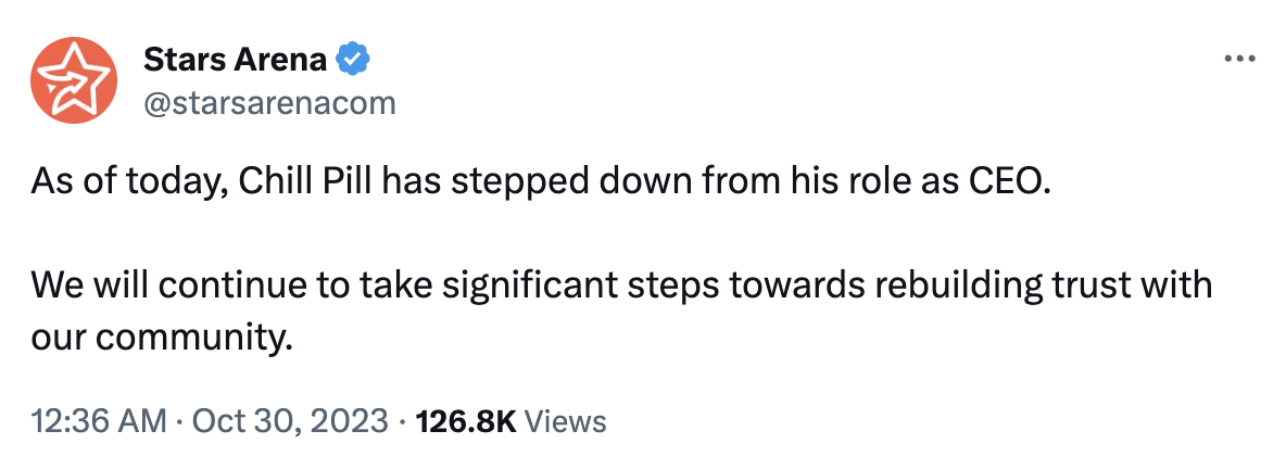 10 月 30 日,Avalanche 生态 friend.tech 仿盘项目 Stars Arena 在社交媒体上发文表示,其 CEO Chill Pill 已辞职,未来将继续采取重大步骤重建社区对其的信任。