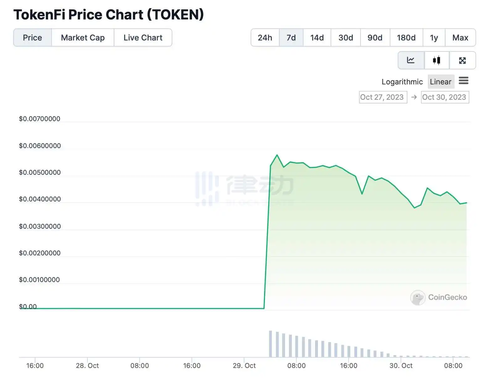 高 gas 费将很多参与者挡在了涨势之外,$TOKEN 的价格在开盘后立刻飞涨,在一个小时内价格涨超百倍,开盘价格为 0.00005011,一个小时后为 0.00537,短时涨幅超百倍。