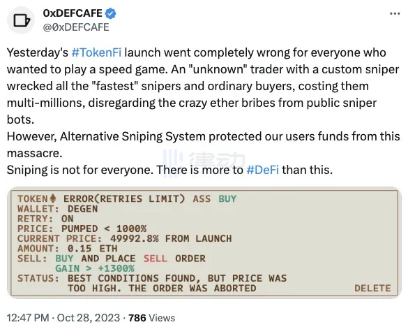 链上分析员0xDEFCAFE在推文中表示,「昨天 TokenFi 的发布完全是错误的。一个拥有定制狙击手的『未知』交易员摧毁了所有「最快」的狙击手和普通买家,使他们损失了数百万美元,无视公共狙击机器人的疯狂『以太贿赂』。」