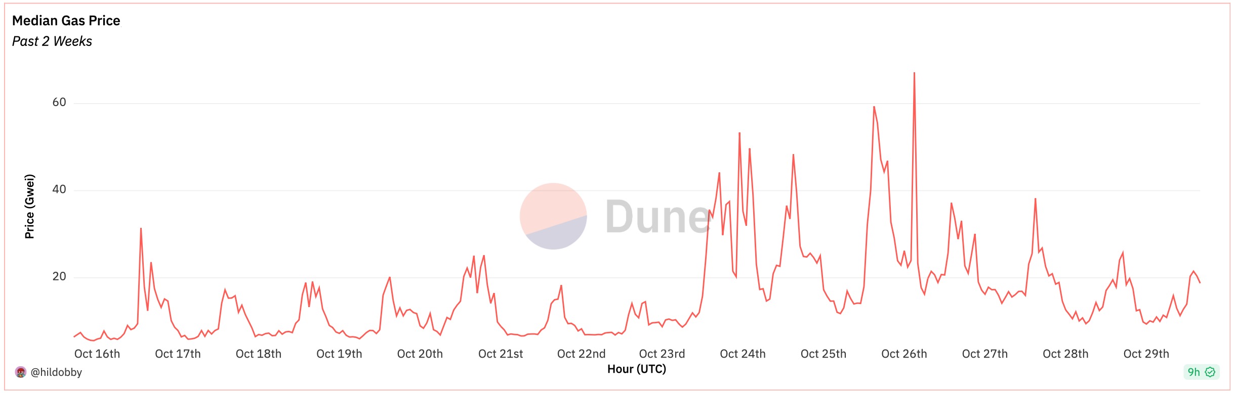 TOKEN 发行当日,据 Dune 数据显示,10 月 27 日以太坊网络的 gas 均费达到了 67gwei 的周内高峰,超出平均值数倍之多。