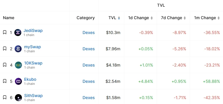 TVL 不占优势:据 DefiLlama 数据显示,Ekubo 的 TVL 为 254 万美元,在 Starknet 主要的 DEX 中排名第四。
