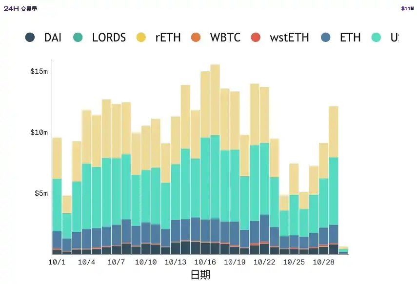 (3)年化手续费:基于上图官方披露的 24 小时交易量 1173.9 万美元,以及日手续费收入 1688 美元,按日交易量 1000 万美元计算,则该 DEX 年收入为 1000 ÷ 1173.9 × 1688 × 365 = 52.48 万美元。
