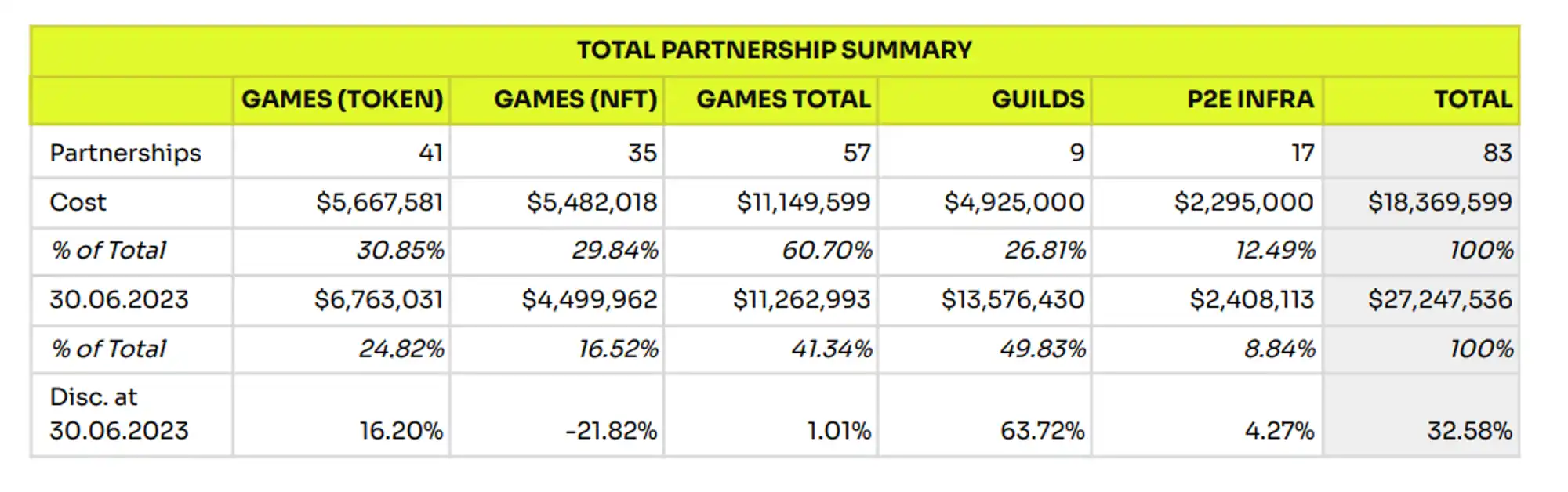 YGG 目前与 83 个项目建立了合作关系,包括 57 个游戏、17 个 P2E 基础设施和 9 个游戏公会。其中值得注意的是,截至 2023 年 6 月 30 日,游戏公会的份额最高,也为 YGG 带来了最高的回报比例。