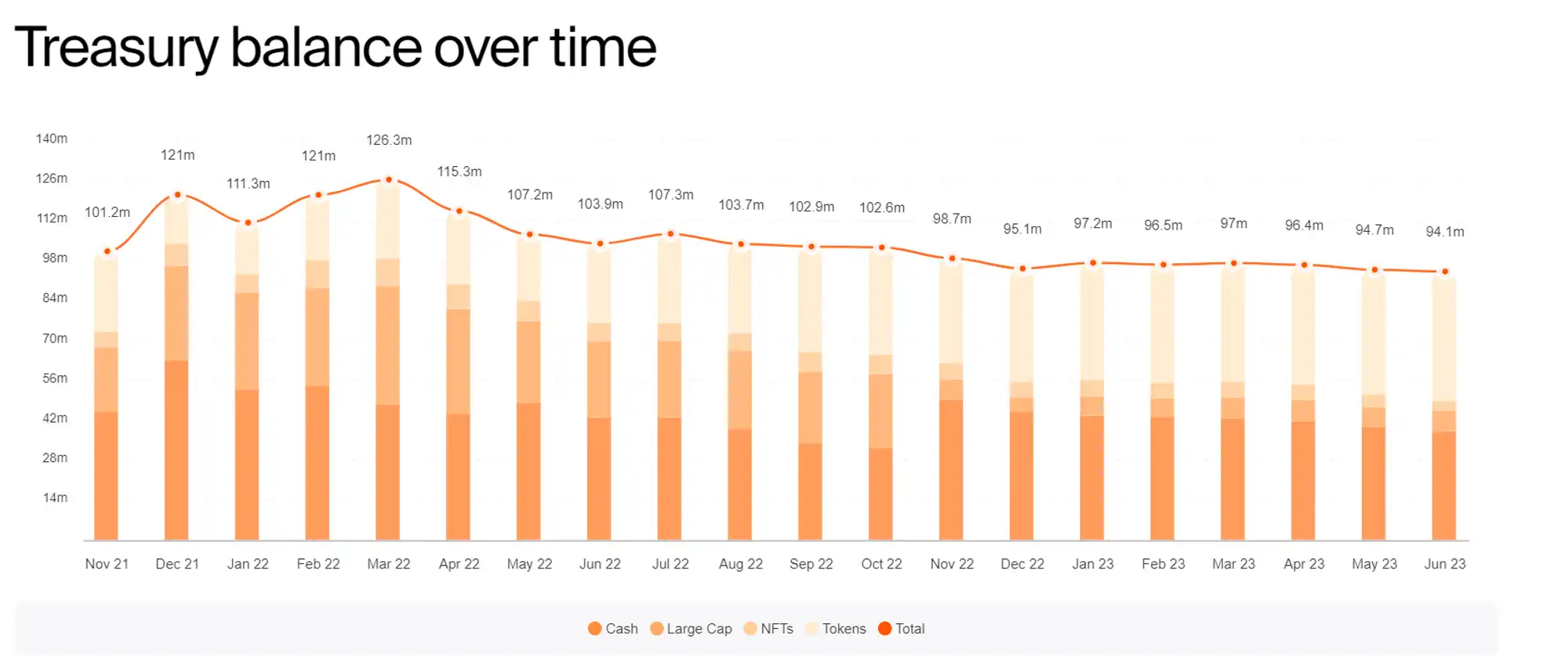 从国库资金分布和国库管理能力上看,Merit Circle 拥有大金额国库($94.1m),并在 Dashboard 中详细公开了其国库资金分布,截至 2023 年 6 月 23 日,AUM 距离 ATH 时降低了 25.49%,这在众多游戏公会中是相对极低的跌幅。目前国库资金中,稳定币总量$38.1m,占比 40.49%,其余主要为一级投资股权。根据 Defillama 数据,YGG 国库($123.77)中高达 94.05% 的代币为 YGG,抵抗风险的能力非常差,也因为 YGG 币价的大量下跌使得 YGG 国库 AUM 较 ATH 下降了 90% 多。