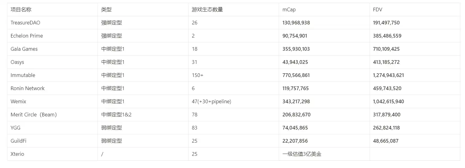 其中,根据游戏平台与单个游戏项目绑定关系的强弱,尤其是业务模式与代币经济模型方面与游戏绑定关系的强弱,我们将这些项目分成四类。其中 Xterio 尚未发行代币和代币经济学,我们在此不对其进行归类,仅进行项目基本面的介绍。
