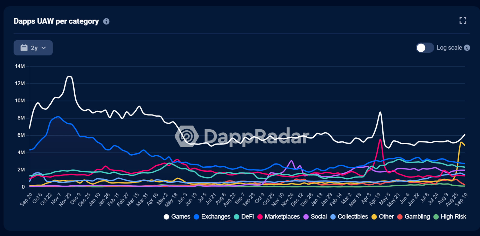 尽管 Gamefi 浪潮退去后,区块链游戏用户的主导地位不断降低,但我们看到,游戏仍然是整个行业最活跃的部分。根据 DappRadar 数据,截至 2023 年第二季度,游戏行业每日独立活跃钱包的数量为 699,956,占行业总参与度的 36%,虽然是 2021 年第三季度以来的最低水平,但仍然领先于其他类型的应用。