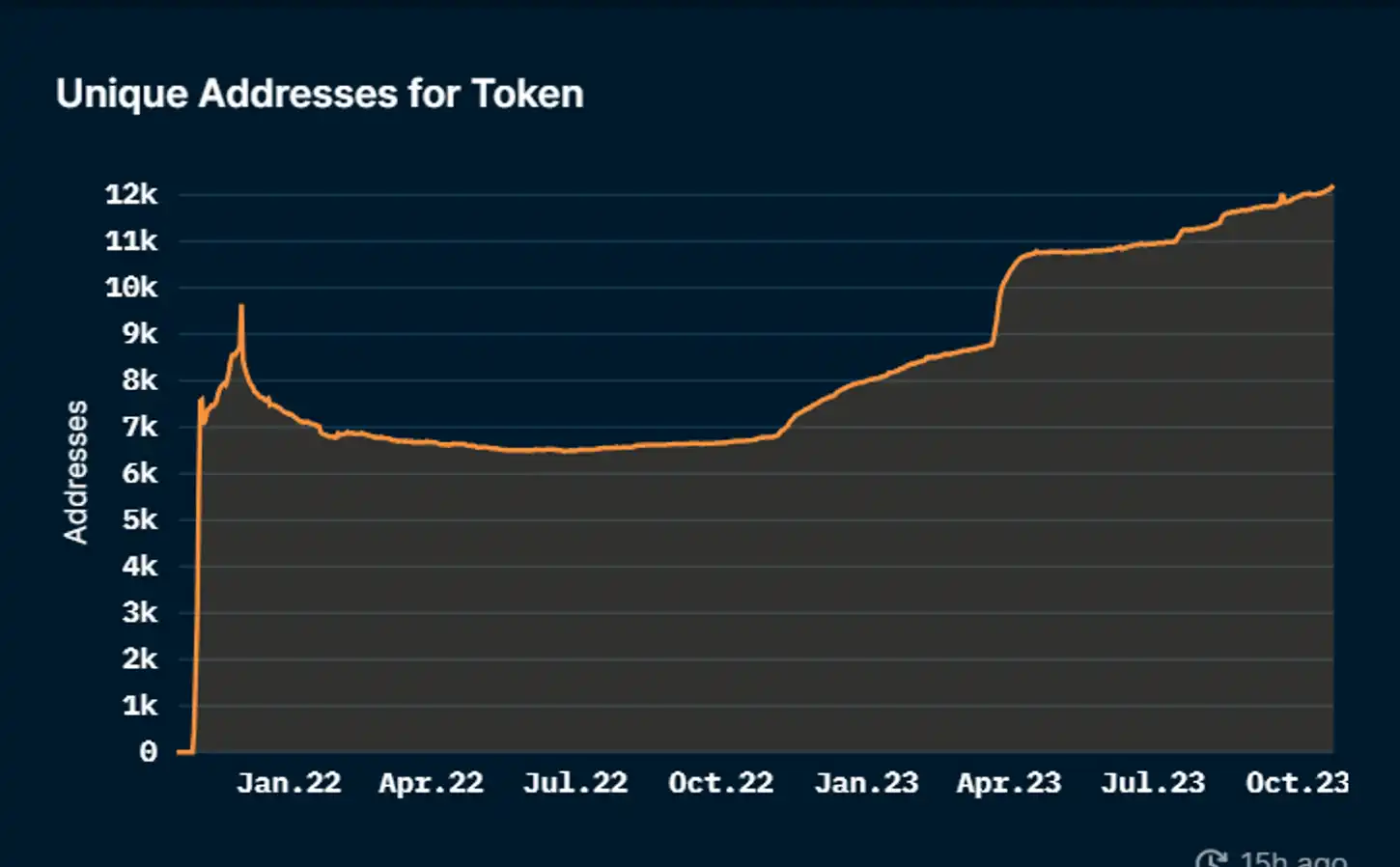 第三,在代币的筹码结构上,目前 MC 的流通量相对较高,后续解锁抛压比较小,从链上数据来看,其 Holders 数量从 2022 年底以来快速上升,目前 Holders 数量在 12000 左右,是 2022 年底的两倍,目前 Holders 数量依然在小幅平稳增长,基本所有筹码的持仓时间超过 1 个月,长期持仓用户占比很高,前 100 入场的地址仍有 85 个地址保持持仓。在筹码结构上,top5 占比较为稳定,约为 25%。