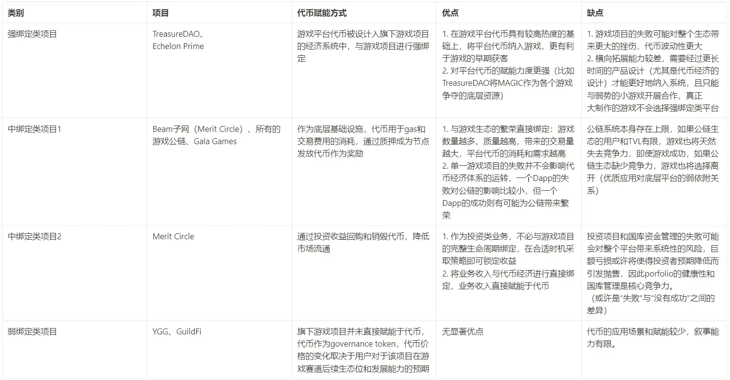 综上,从业务类型和代币赋能方式来看,我们认为中绑定型的游戏平台是最健康的一种类型,具有一套独立的经济和业务循环逻辑,是真正独立于游戏之上的 Web2.5 Game 的基础设施和服务商,生态的横向扩张能力较强,同时其经济模型也保证其能够直接受益于游戏生态的成功,是一种良性的利益绑定关系。