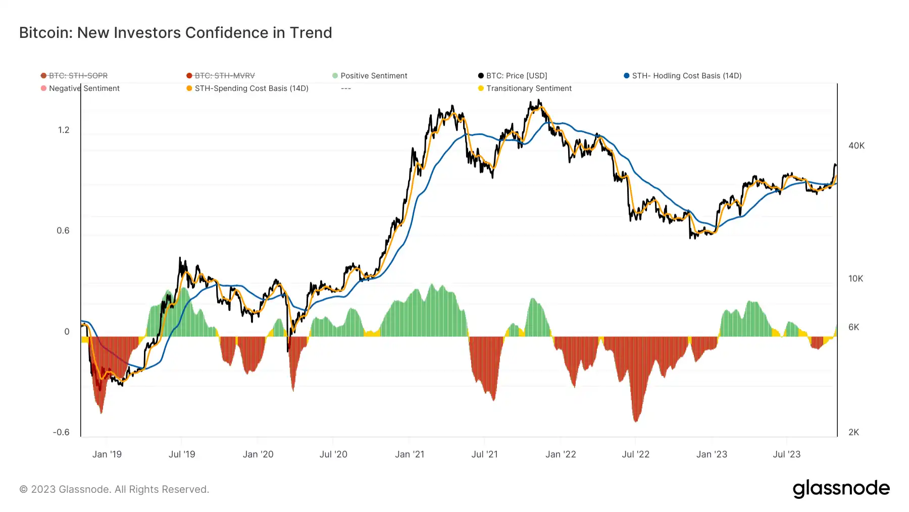 积极情绪到⾼位后引起了⼀定的市场 fomo 贪婪情绪但仍不够 fomo。截⽌写⽂当前价位为 34K,短期持 有者平均成本⼤致为 28K,链上筹码盈利百分⽐为 89%。如亏损恐慌情绪⽆太⼤变化则谨慎看空。