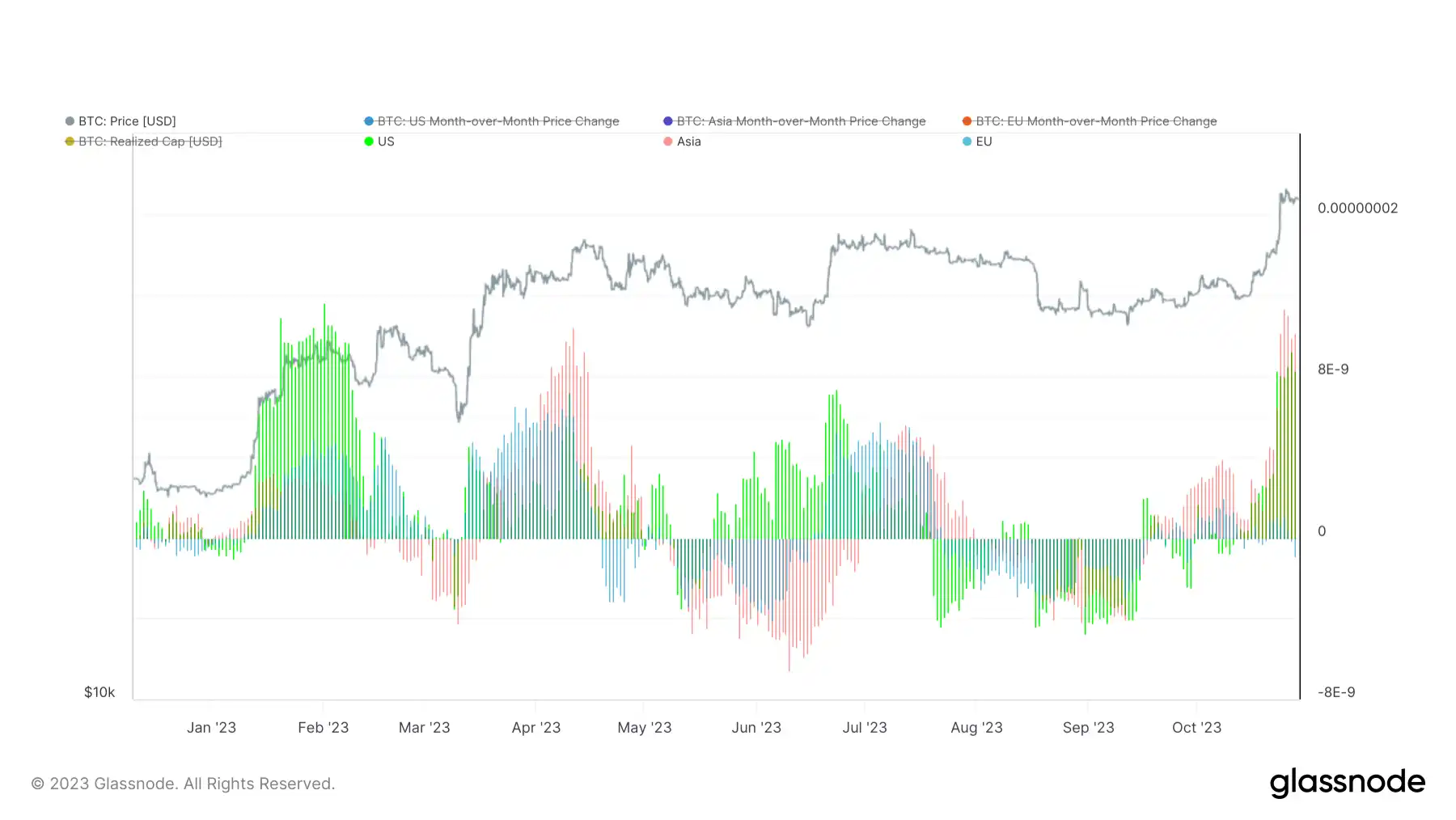 虽然美债已经继续连续升⾼突破了这段时间的⾼点,但是加密因为市场结构也不同和⻓期投资的挤 压,对于市场还是造成了⼀定的向上增⻓的效果。不管如何,独⽴的周期作⽤已经开始显现。