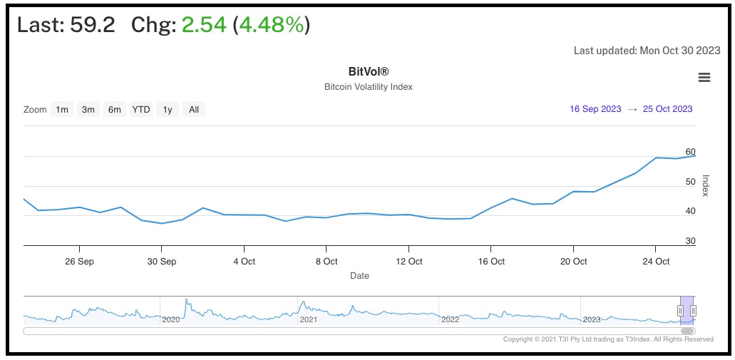 近一周以来,比特币价格在站上三万后就一直在 34,000 美元上下波动。调整之后,比特币价格能否一鼓作气继续上升,市场上的信息还不是非常明朗。从 BitVol(比特币波动)指数图表中可以看出,市场中的比特币期权交易者对比特币价格未来的波动性更加关注,预期价格波动也更大。